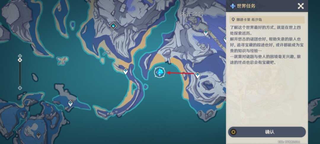 任务前引:旅行者在希汐岛南侧,遇到(meet)了垂钓的佩卡尼,并帮助其寻找影响垂钓的原因