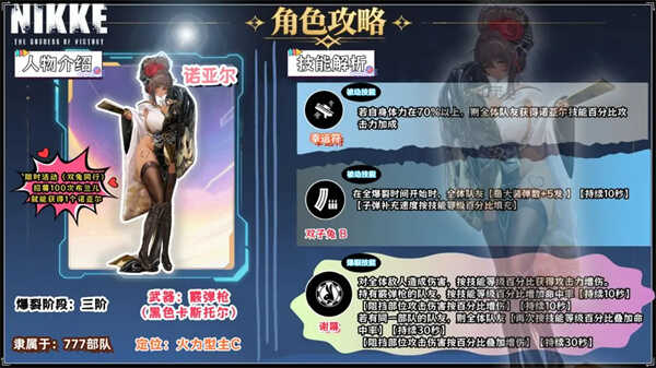 1号位:诺亚尔,提(ti)供团队攻击力增益、为霰弹枪队友提(ti)供命中率和伤害加(jia)成(cheng)。