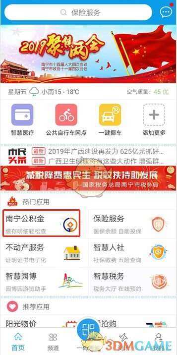 1、在“爱南宁APP”实名登录(lu)后,点(dian)击(ji)首页(ye)热门应用(application)“南宁公积金”,进入页面(yemian)后点(dian)击(ji)“公积金业务办理”。