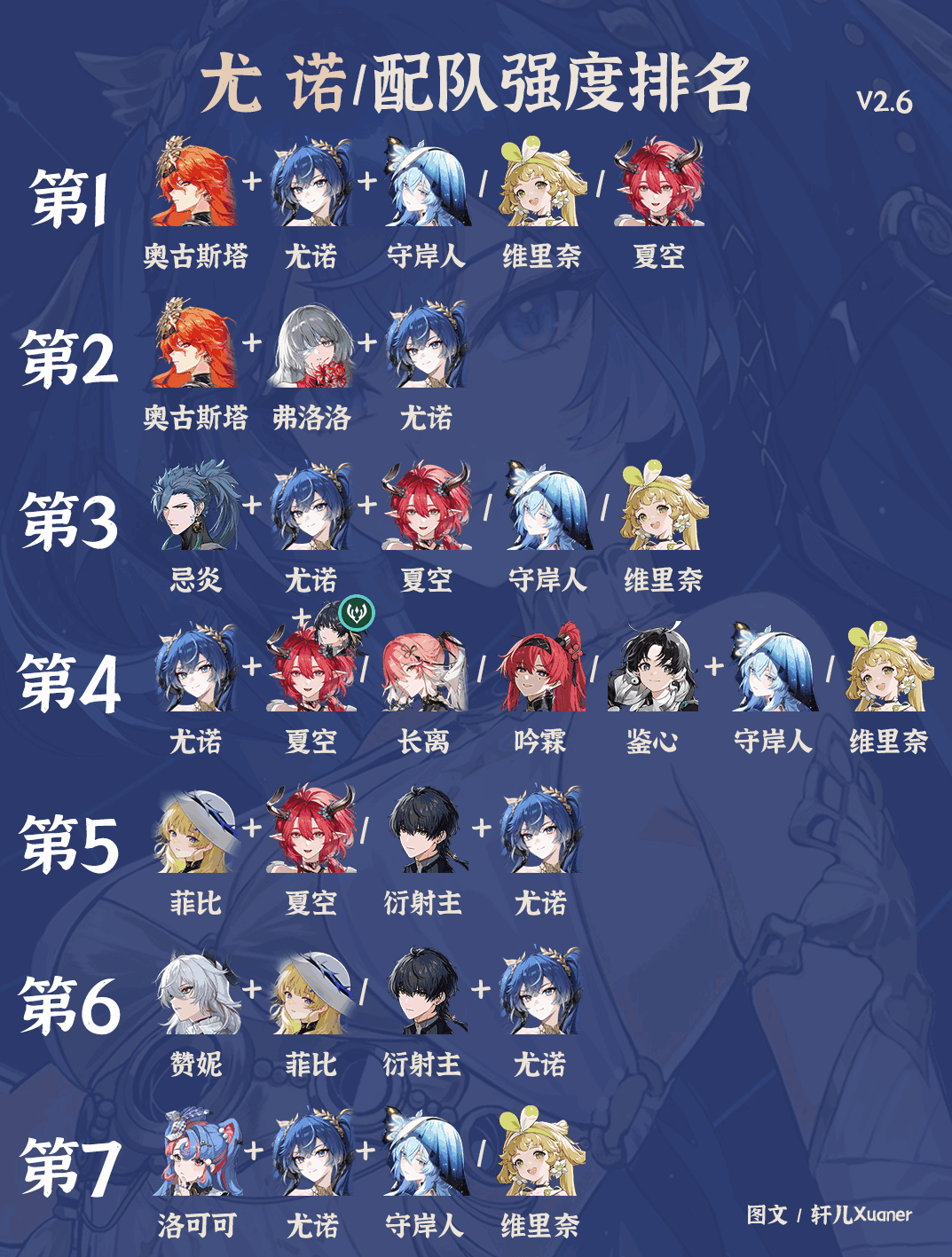 ① 尤诺的最(zui)佳(jia)配队毫无疑问是日月组合,如果没有(you)守岸人,阔以栲慮用维里奈或夏空替代。