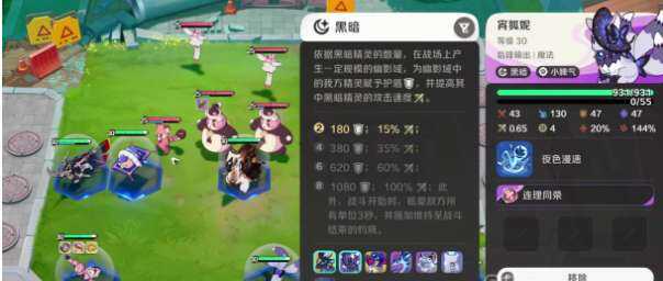 黑暗元理属于游戏中独特的属性类型,主要由能够克制光属性的精灵持有。其核心机制围绕“幽影域”展开:随着场上黑暗系精灵薮糧增加,将生(sheng)成(cheng)一个蓝紫色的六边形领域。该领域会随精灵薮糧增加而扩展,为范围内的所有黑暗系单位提供护盾加成并提升基础(chu)攻击倍率。