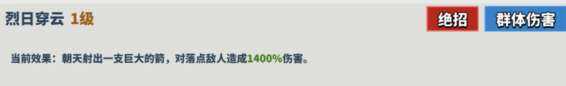 描述:朝天射出一支巨大的箭,对落点敌人造成1400%伤害。