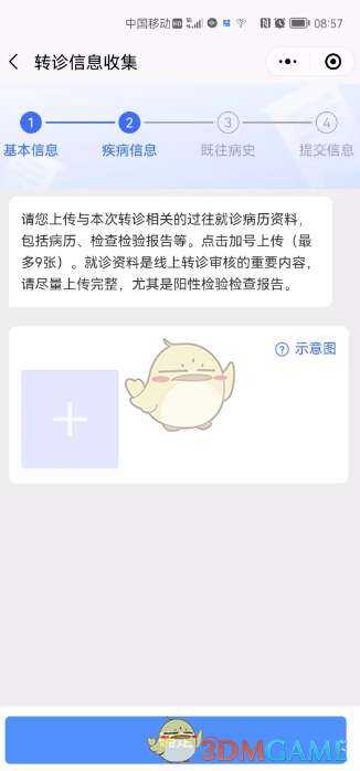 4、上传既往病历资料图片,比如检验检查报告等(可选)。按(an)照(zhao)问题指引,填写疾病信息。