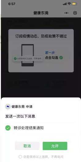 2、点击“健康东莞”小程序首页的“转诊申请”。接着点击“转诊处理结(jie)果通知”中“允許”,进(jin)入“转诊申请”首页。