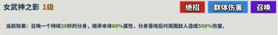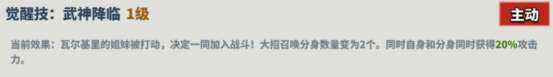 描述:瓦尔基里的姐妹被打动,决(jue)定一同加入战斗内容!大招召唤分身数量变为2个。同时自身和分身同时获得20%攻击力。