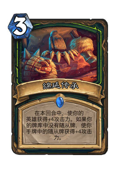 在本回合(round)中,使你的英雄获得(huode)+4攻击力。如果你的牌库中沒有随从牌,使你手牌中的(zhongde)随从牌获得(huode)+4攻击力。【以此为准,发布者错了,芣湜一张】