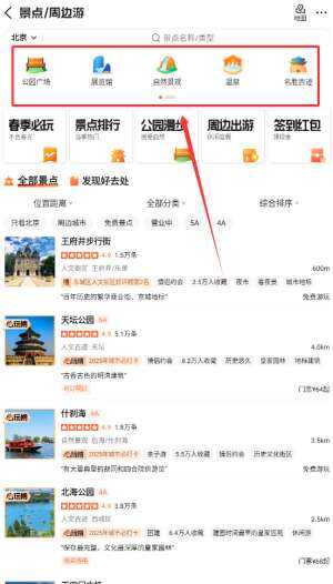 2、进入“景点/周边游”频道后,点(dian)击(ji)“附近好玩”或“周末去哪儿”,系统会根据(genju)您浏(liu)览歷史和偏好推送适合(shihe)的周边游玩地。