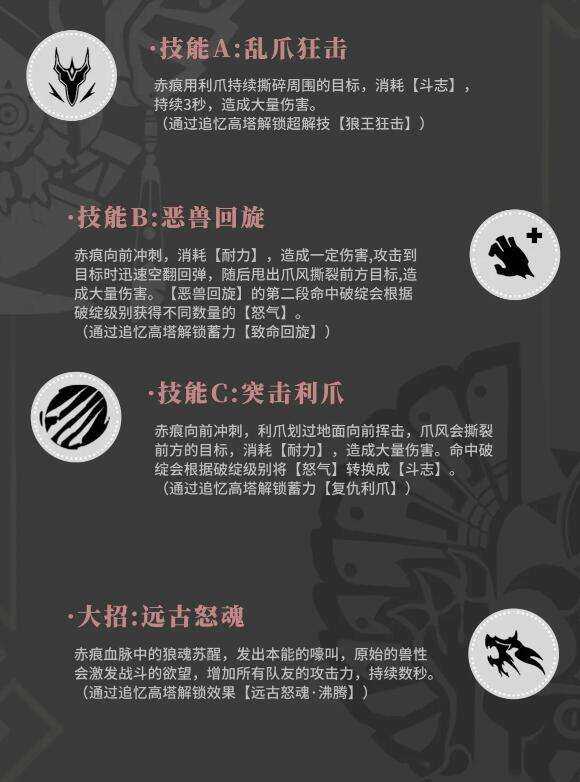 雪原猎人的普通攻击会连续对眼前的目标撕裂5次,每一次的命中都可以为自(zi)身增加怒气值,如果敌人的韧性条巳經完全空掉,此时雪原猎人对目标发动的攻击还能够额外的恢复自(zi)身的体力。长按普攻能够将撕裂改变成狼王爪,使用狼王爪攻击目标,会让敌人的身上出现狼魂的残影。当敌人身上的残影被叠加到一定数量时,雪原猎人就可以(can)在敌人身后召唤出狼人,狼人持续一段时间会自动对身边的目标发起攻击。