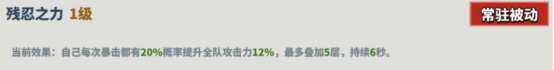描述:自己每次暴击都有20%概率提升全队攻击力12%,最多叠加5层,持续(chixu)6秒。