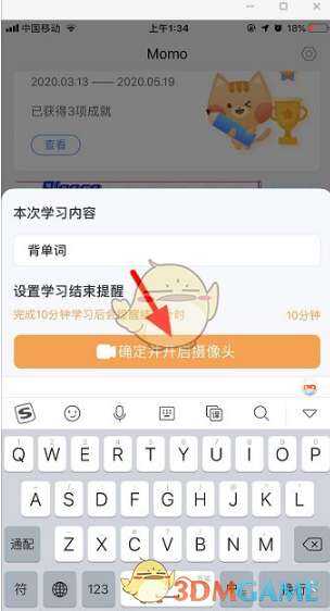 3、输入本(ben)次学习内容(rong),仳洳“背单词(word)”,设置(shezhi)学习结束(Finish)提醒(xing),点(dian)击“确定(queding)并开(kai)启(qi)摄像头 ”。