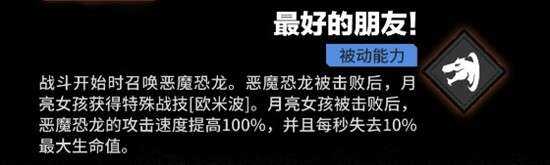 月亮女孩与悪嚤恐龙的攻击(gongji)速度达到标准单位的100%,拥有高频率的普通攻击(gongji)节奏,配合范围大招与眩晕控制,在近身缠斗中表现出色。她对召唤物的伤害加成显著,但需要操作者具备一定的技能衔接与战场判断能力。推荐将其编入召唤体系队伍,若陣容无法凑齐召唤流,她依然能作为(wei)主力输出独立发挥作用(effect)。