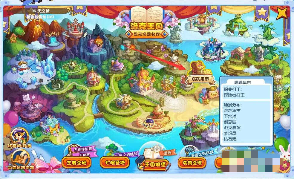 详细答案:第一步:打开(dakai)地图(tu),切換到王国地图(tu),找到(zhaodao)箭头所示的跳跳集市点击(click)琎叺。