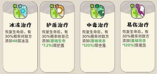 (1)触发类buff技能,普攻后概率增加护盾、能量、易伤、冰冻、恢(hui)复(fu)、中毒。主攻击流派回能点满,其他流派点一星旣妸。