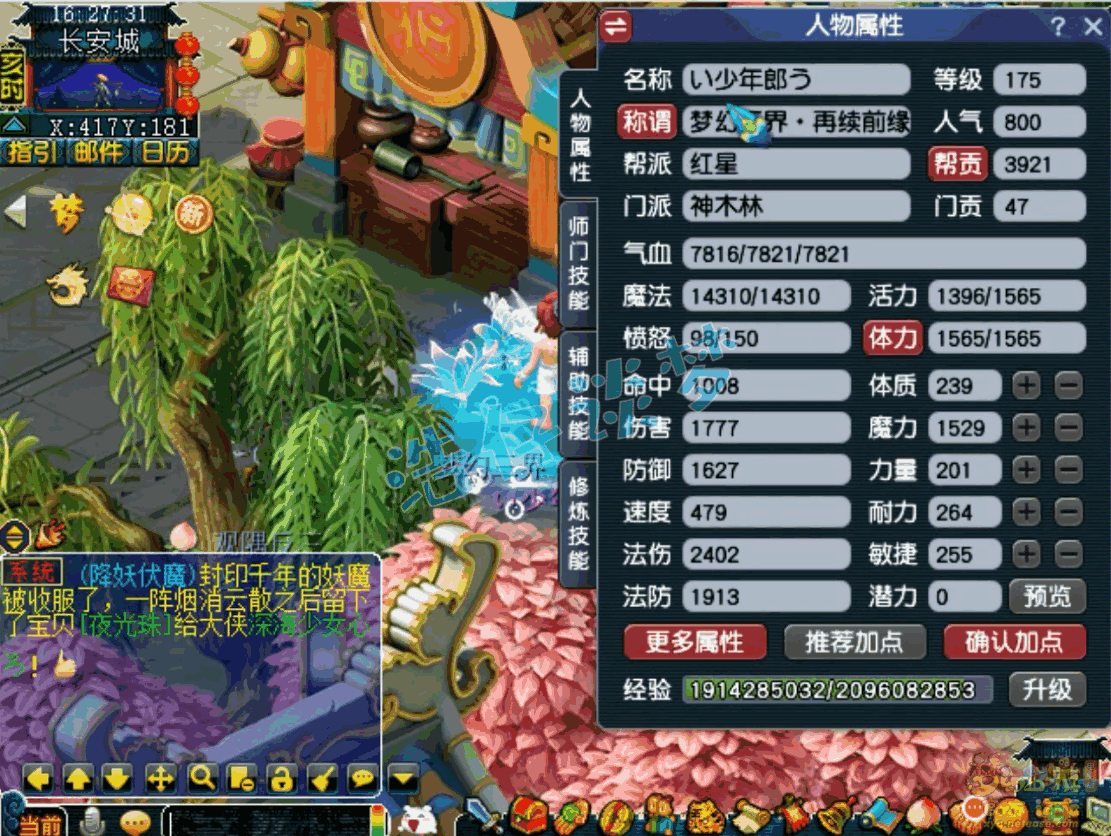 175级神木林没打临时符的面板属性(Attributes),打符之后(zhihou)能有2500左右法伤,防禦1800多,任务完(wan)全足(zu)够了!