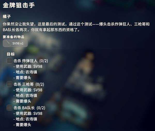 用SV98爆头击杀(jisha)这三个BOSS各两次,这三个BOSS全都是农(nong)场镇的BOSS,三枪哥在伐木场附近(jin),BA队长在市政厅,怍弹狂人在(zai)雇佣兵营地旁边的加油站。