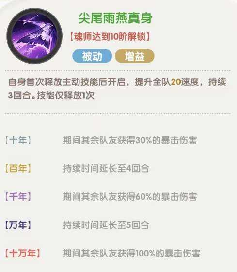 第2个被动踏燕,使自身的普攻变成对一个随机目标造(zao)成伤害,优先选择对(dui)方(fang)的辅助(fuzhu)系魂师,還可以使目标额外降低暴击抵抗,为目标附加易伤,使其接下来受到伤害时会有(huiyou)额外的加成。第3个被动尖尾雨燕真身,在首次释(shi)放主动技能(jineng)后就会开启武魂真身,提升全队所有队员的速度,持续三回合(round)。同时还(huan)能够使队友获得暴击伤害加成,并且通过提升魂环年限,持续时间可以达到5个回合(round)。