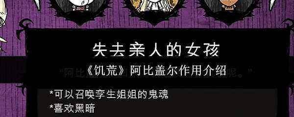 饥荒阿比盖尔用途介绍但要注意阿比盖尔是机制召唤,因此也让不少人在使用温蒂时不晓得该怎么做才能让阿比盖尔出现。其实,将姐姐召唤出来的方法特别简单,只要按小编所介绍的流程走,更多精彩内容请看下面介绍。