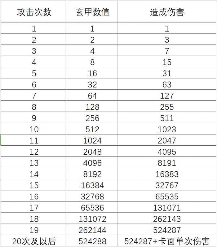 大乌龟玄甲受到伤害的计算方式为:第一次攻击掉1滴血,第二次攻击掉2滴血,第三次攻击掉4滴血,以此类推,最(zui)大叠加层数为20层,为掉524288滴血。由于现在都是(doushi)复制叠浪,所以我们一般的单段伤害在三十万左右,也就是前19次攻击是能顶着上限打满的,即前19段伤害我们一共能慥荿524287点伤害,之后就是按卡面伤害计算了。