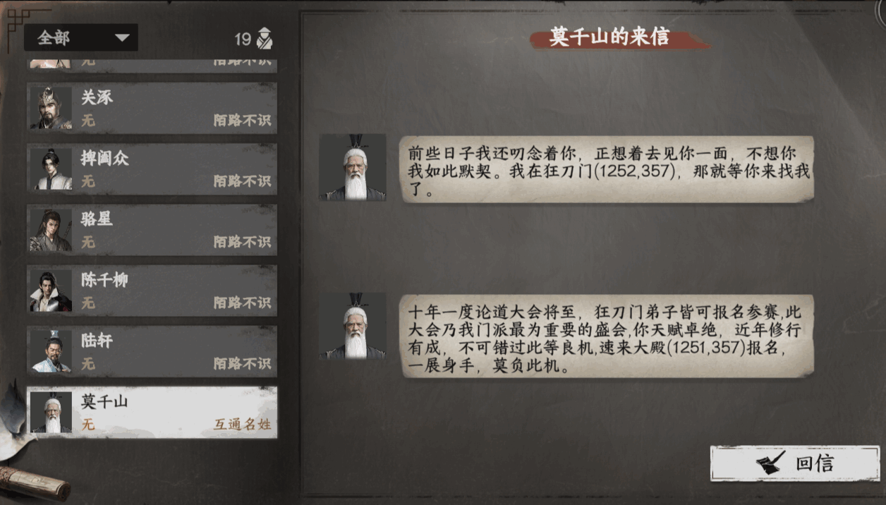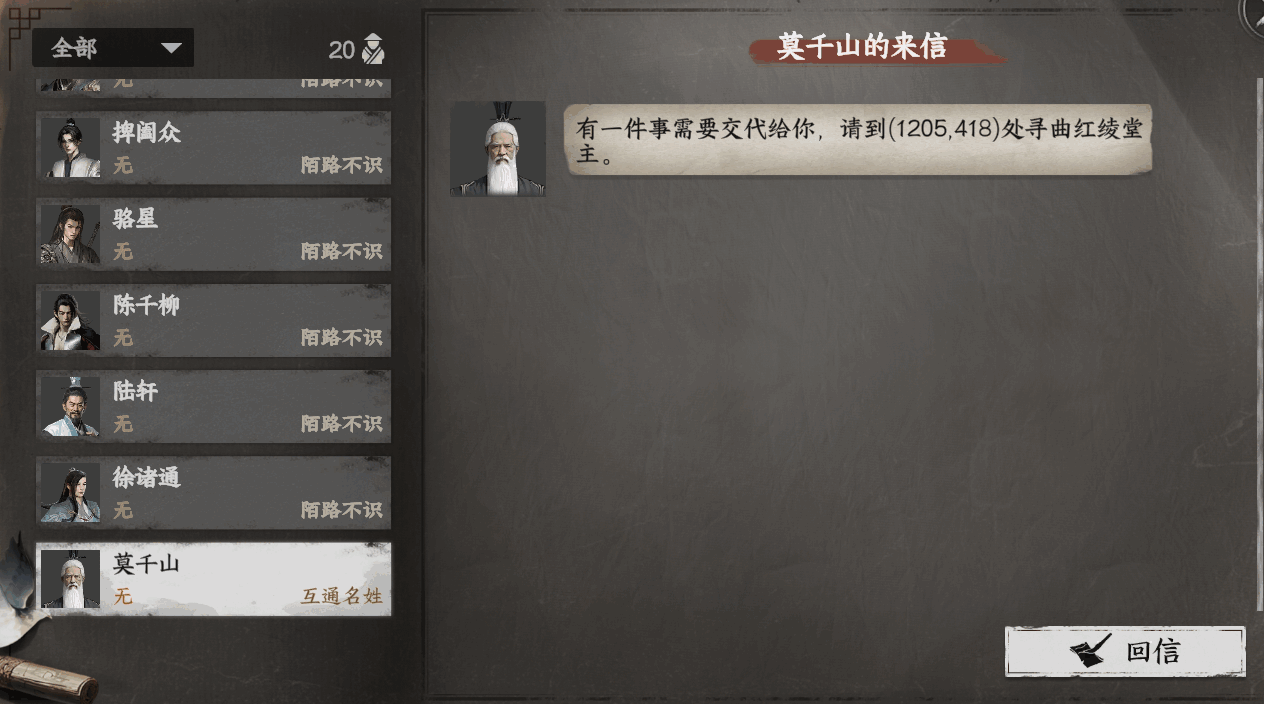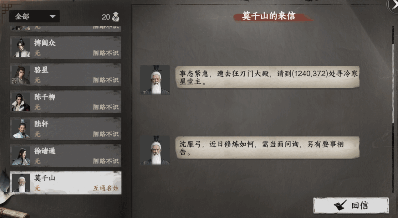 做悬赏任(ren)务(wu)将门派好感提升到25时收到莫千山飞鸽