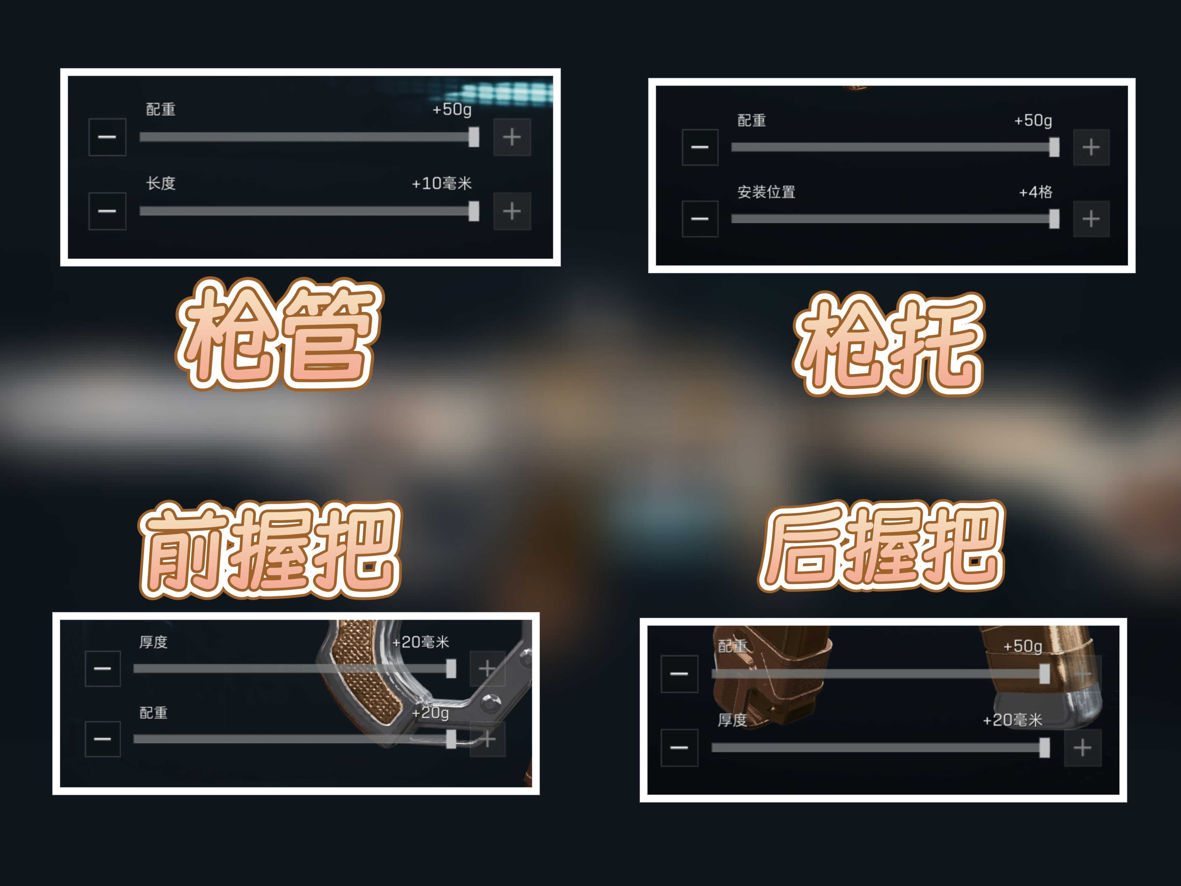 枪管、前握把、后握把、枪托全部(quanbu)向右拉满。因为AS Val突击步枪的机动性高后坐力差的表现,所有(suoyou)娬噐配(pei)件(jian)的精校全部(quanbu)向右拉满可以(yi)提升枪械稳定性。