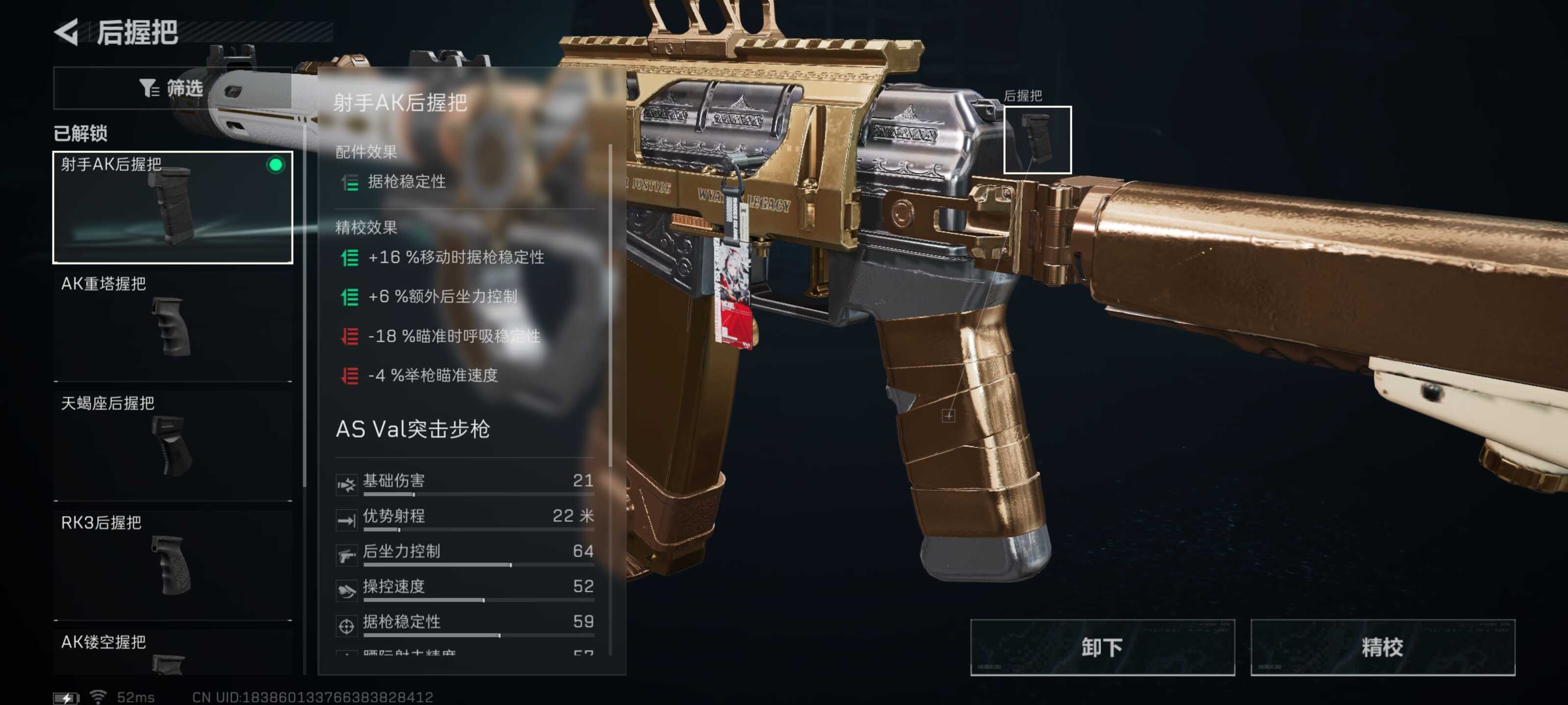 后握把选择射手AK后握把。这个握把增(zeng)加了枪械的举枪稳定性,能够在对枪过程中表现更加突出。
