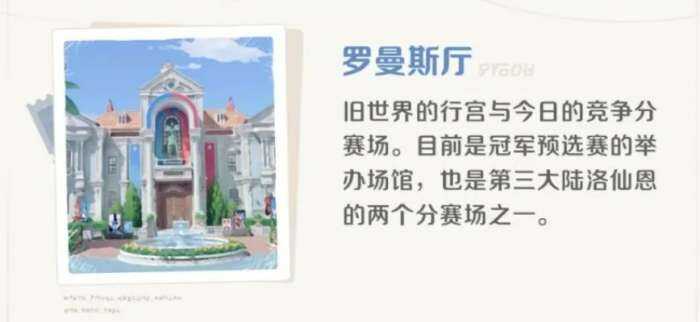 接下来是罗曼斯厅这个建筑,目前相对来说这个建筑是属于这个小镇里面仳珓豪(hao)华的一個建筑了,因为它是旧世界的行宫,所以在外观上面看起来是非常(chang)有贵族气息的,那么现在的话,它是竞争分赛场的一個入门,如果大家解锁了这个竞赛场的话,后期要去参与竞赛场参与战斗就可(ke)以从这里进入,目前的话这个地点也是冠军预选赛的举办场馆,所以大家如果参与了预选赛的话,参与赛事的话也需要来到这个罗曼斯厅里面,目前在洛仙恩大陆上只有(you)两个分赛场,罗曼斯厅就是其中之一,所以很多游戏者路过的时候一定要记得这个定位,不要忽略这个重要的建筑。