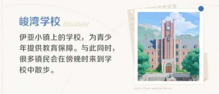 第三个建筑就是峻湾学校,这个学校所在的地点很多游戏者在做任务的时候曾经来到过,这个属于伊亚小镇上为青少年提供教育(jiaoyu)的一所学校,很多的小镇居民其实是会在傍晚的时候来到学校中散步的,所以如果大家根据时间的不一样,在这个建筑里面找到自己想要的NPC还是有一定可能性的。