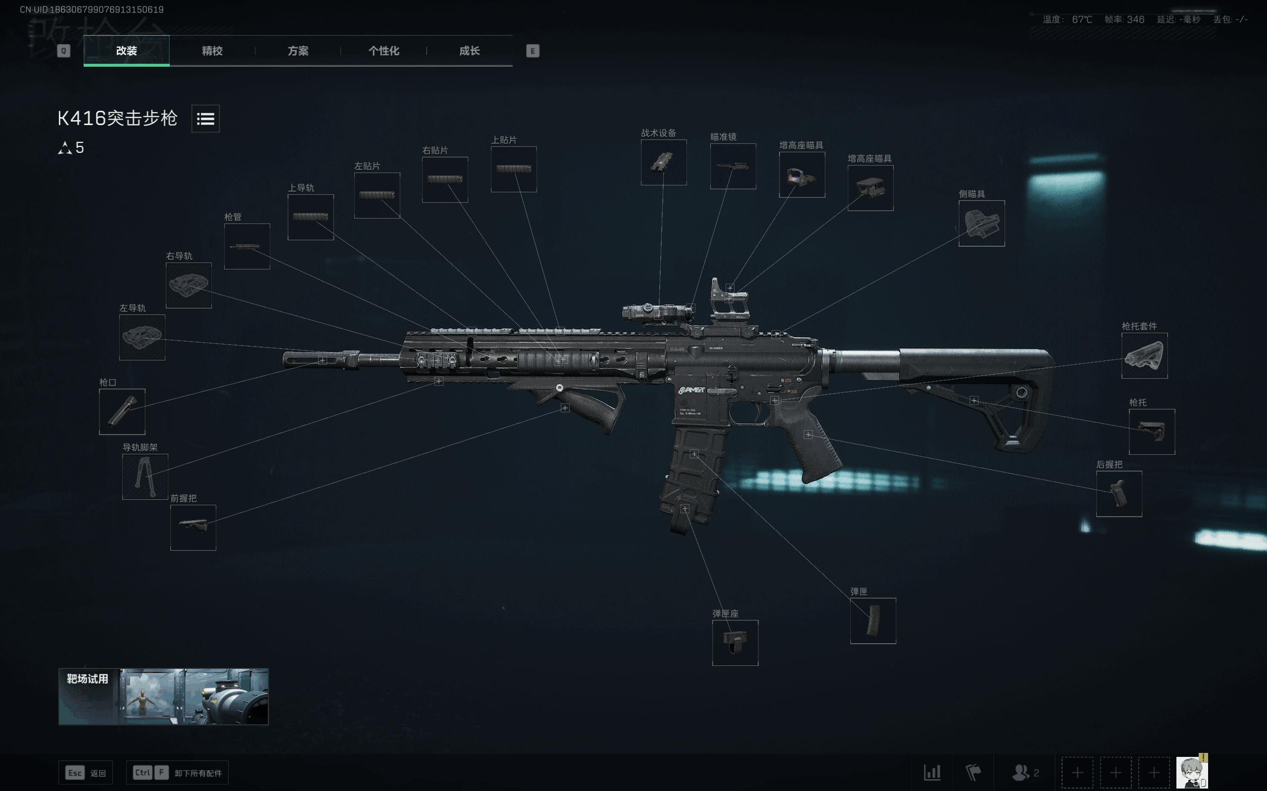 从數據种可以得出:改装K416突击步枪是一款综合性能均衡、稳定性突出的枪械,以“中距离精准压制”为核心优势。高射速与低后坐力的结合使其兼具火力密度与操控性,长屏息时间和低晃动进一步提(ti)升(sheng)了持续作战能力。尽管近距离腰射和远程伤害表现中规中矩,但其泛用性和容錯率使其成为从新手到进阶玩家的可靠选择,尤其适合注重“稳扎稳打、精准输出”的战术风(feng)格,是团队中中近距离火力支柱的理想武器。