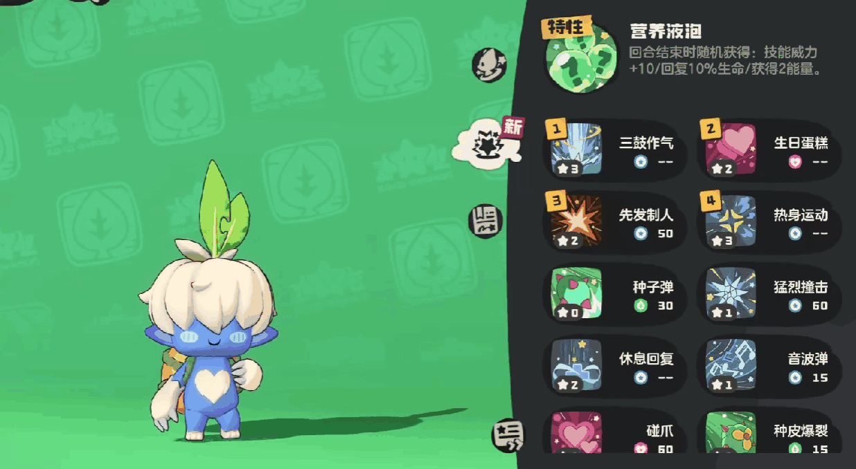 舞动路路的特性是“营养液泡”,在回合结束时,可以随机获取技能威力加十、回复10%的生命数值、獲得两点能量的效果,该特性可以为舞动路路提供续航能(neng)力(li),同时,它附带的主要技能有三鼓作气、生日蛋糕、先发制人、热身运动。