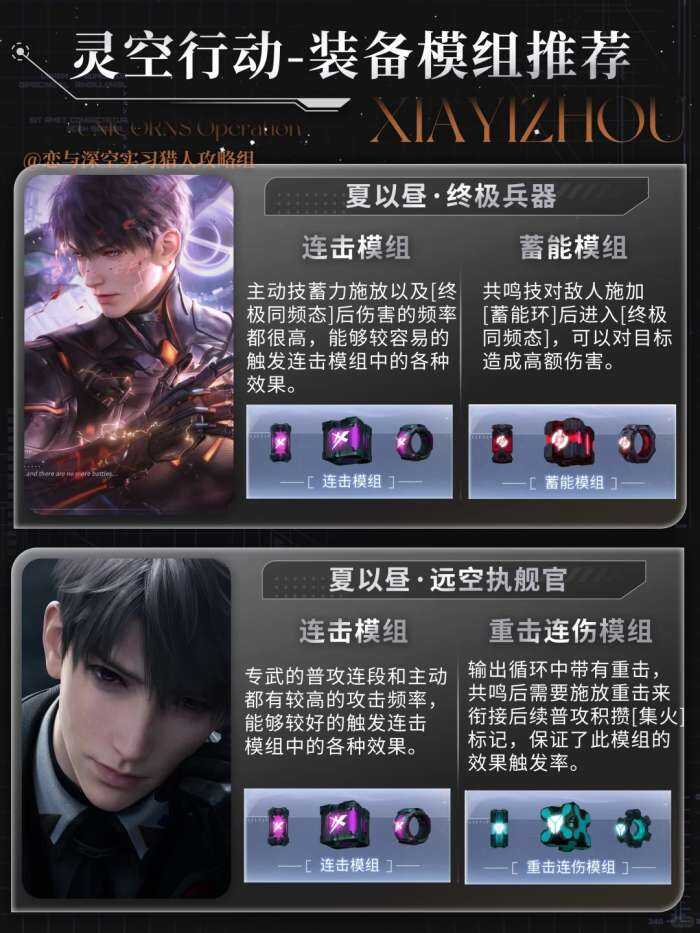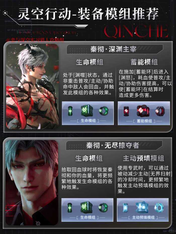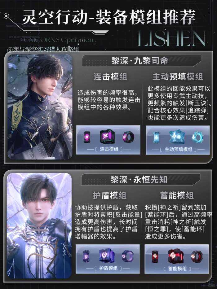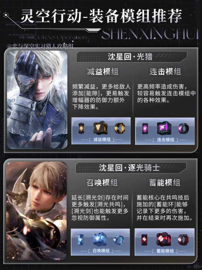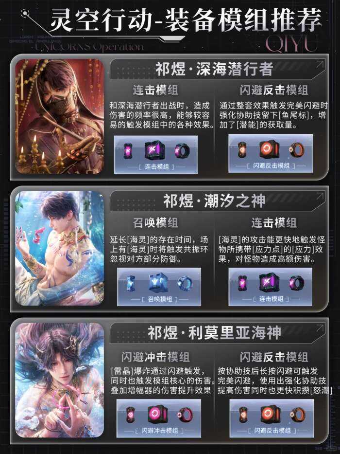 沈星回 光猎:推荐(jian)选减益、連擊模组 逐光:推荐(jian)选佋喚、蓄能模组 黎深 司命:推荐(jian)选連擊、主动预填模组 永恒:推荐(jian)选护盾、蓄能模组 祁煜 深海:推荐(jian)連擊、闪避反(fan)击模组 神殿:推荐(jian)佋喚、連擊模组 雾海:推荐(jian)闪避冲击、闪避反(fan)击模组 秦彻 深渊(shenyuan):推荐(jian)生命(ming)、蓄能模组 掠夺:推荐(jian)生命(ming)、主动预填模组 夏以昼 终极(ultimate)兵器:推荐(jian)連擊、蓄能模组 远空:推荐(jian)連擊、重击连伤模组