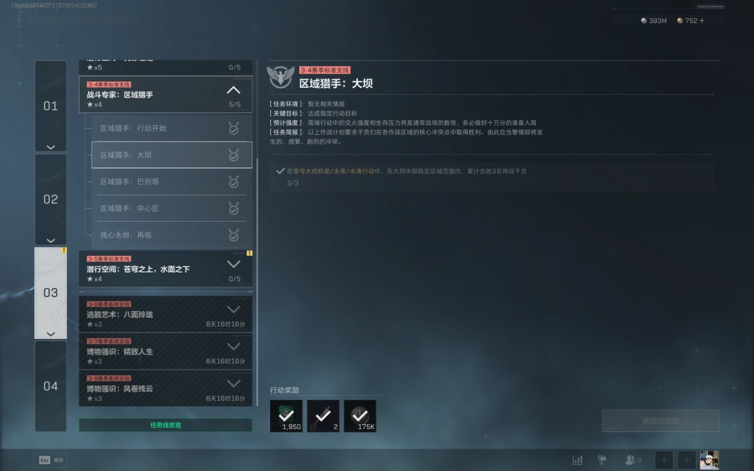 1、任务目标(Target):在零号大坝机密/永夜/水淹行动中,在大坝中部指定(specify)区域范围内,累計击敗3名特战干员