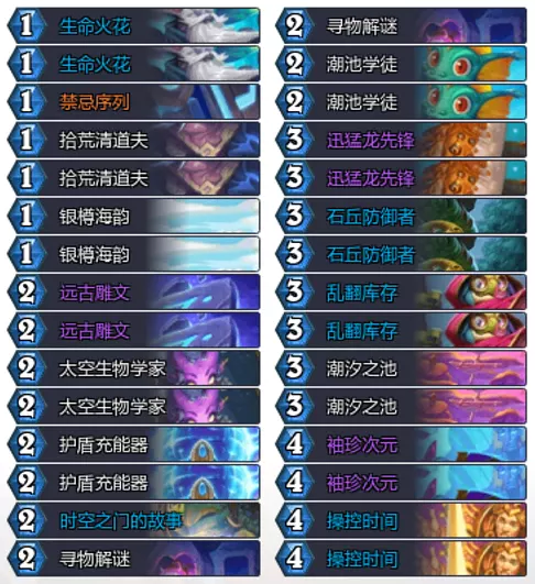 起手留牌:禁忌序列(任务),生命火花,远古雕文,寻物解(jie)谜,潮汐之池,找不同,操控时间,加工失误。 打快攻:银樽海韵,玩具故障,护盾充能器,乱翻库存,浪潮涌起。 打慢速:袖珍次元,列王遗宝(打防战找轮盘)