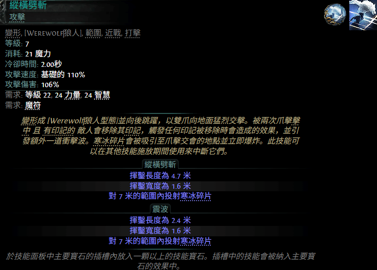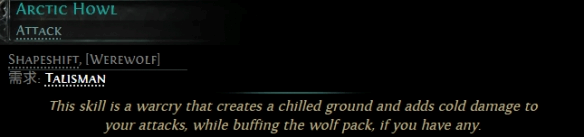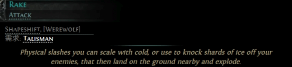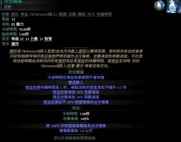 变形成狼人获得增益,为自身和狼召唤物提供大量攻速、移速和额外冰伤,攻击可召唤月光自动攻击。