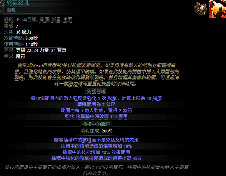 变形成巨熊进行防御嘶吼,获得盛怒并强化后续攻击的护甲破坏(pohuai)效果。可镶嵌并增(zeng)强其(qi)他人形战吼。
