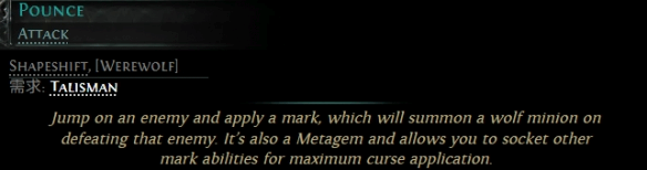 跳跃攻击并施加标记,击败被标记敌人可召唤狼灵。这是一个元技能,可镶嵌其他标记类技能。