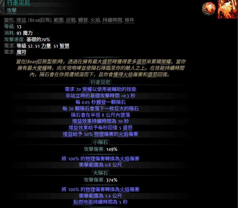 当在巨熊形(xing)态时,积攒“荣耀”后召唤陨石雨,自身获得火焰伤害(harm)和盛怒回复。