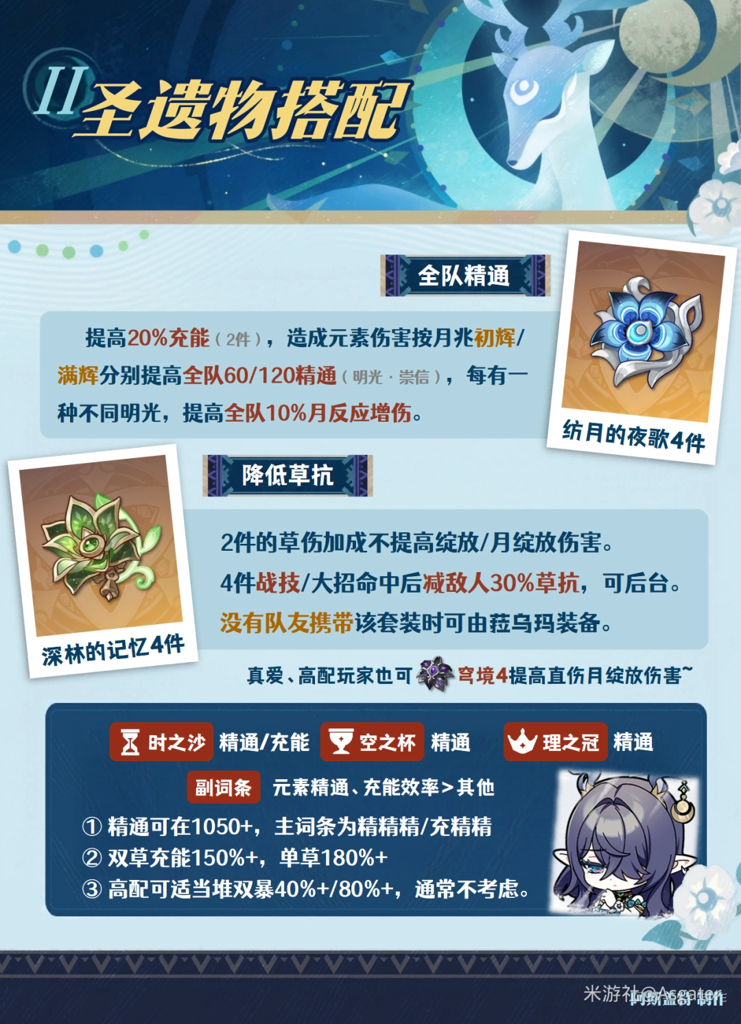 ①【纺月4】是首选套装,需注意的是,“月辉明光”效果(guo)是不同种类的才能叠(die)加(jia),同时水草元素触发的月绽放不能获得(huode)提升。