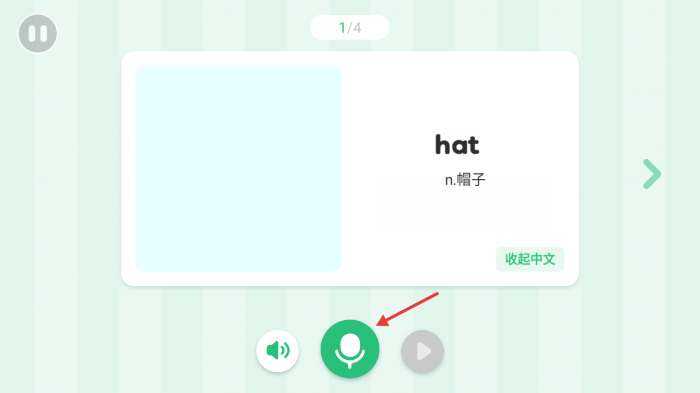 4、在词汇预热环节(link),看菿单词如【hat】时,我们可以点(dian)击下方的绿色麦克风按(an)钮(niu),跟着读音跟读,练习纯正发音。