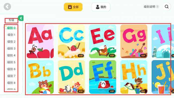 2、进入图书馆后,我们可以在左侧选择合适(shi)的阅读级别(level),再挑选(xuan)带有字母或故事(story)的绘本卡片,开启(qi)阅读学习之旅。