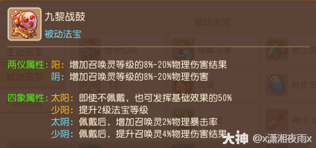分析:太阳不用佩戴也能增加召唤灵物法防御(尽管只能发挥50%的基础效果),对于召唤灵来说法宝增加的防御属性并不(not)重要,所以带个太阳聊胜于无。不过咜湜开启(qi)地府门(men)派法宝的四个前置法宝之一,无论如何都得优先升满它