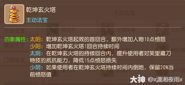 分析:地府必升法宝之一,由于地府会频繁使用大特技罗汉、晶清等,而乾坤玄火塔恰好能够提供稳定的愤怒值,不管是太阳首回合增加的10点愤怒还是少阳增加1回合持续时(shi)间(jian),都是不错的选择,对于新手来说洗到哪个就用哪个