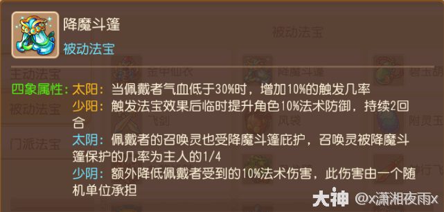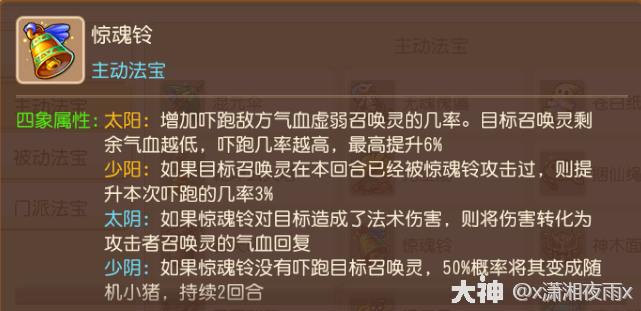 法宝效果:对敌方召唤灵使用,有几率将其吓的立即逃跑