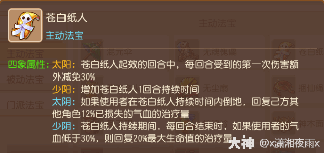 分析:二速地府必升法宝之一,少阴能够在回合结束时对于残血目标回复20%最大生命的治疗量,非常适合地府被封杀倒地时,当回合无法使用门(men)派技能,龟速拉起来后可选择少阴纸人保命,同时在单人PK中面对输出也有一定的使用率