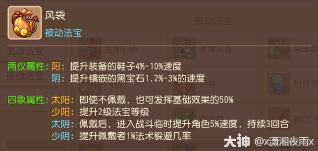 分析:地府可选法宝之一,除了抗性以外,速度对于地府来说也很重要,而风袋提供的速度加成非常可观,太阴能够在进入战斗内容3回合内临时提升5%速度,而少阴能够增加法术躲避,对于新手来说洗到哪个就用哪个,如果是三速奶可以不戴它