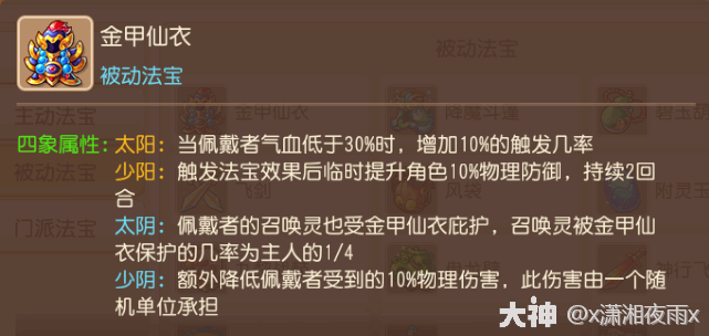 法宝效果:战斗内容中使用,使自身在3回合内减免部分粅理和法术伤害