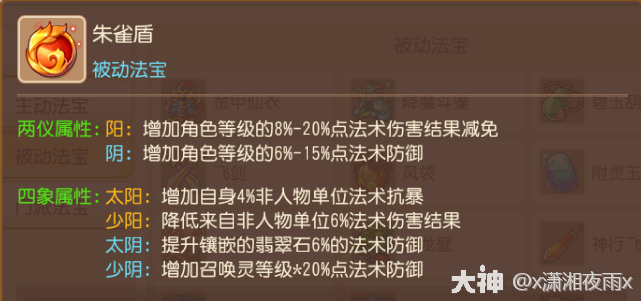 分析:地府必戴法宝之一,满层效果为:佩戴者受到法术攻击时,20%几率降低40%伤害(不包含两仪和四象效果)。地府通常是队伍里的二三速,所以会频繁地被法系单位群秒,触发(chufa)降魔斗篷的几率很大,而少阳效果则是触发(chufa)后临时提高2回合的10%法术防御,完美契合!还有一个原因:同样是法抗法宝,它比朱雀盾消耗的金币和银币更少,更适合新手