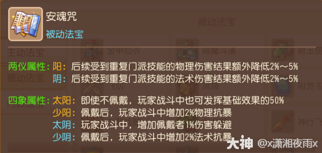 分析:门(men)派法宝属于特殊的主动法宝,不管是两仪阳属性的速度加成还是阴属性的物防加成,对于新手地府来说都必不可少,所以不考虑使用后的效果如何,只取两仪的三条属性,增加自己的速度和物防