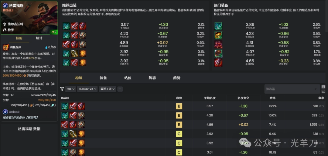 推荐亡者的短剑饮血剑斯特拉克的玩法挑战护手作为格雷福斯在云顶之弈中(zhong)的(de)最佳(optimal)出装。格雷福斯最热门(remen)的出装是饮血剑,斯特拉克的玩法挑战护手,泰坦的坚决