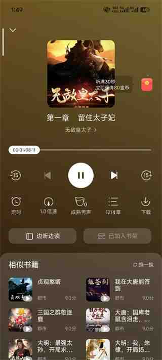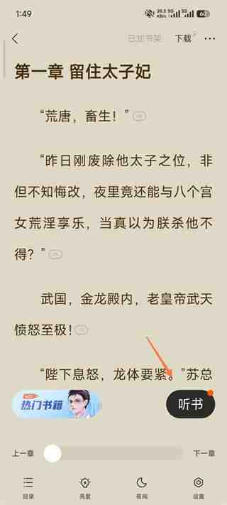 3、如果你不想看小说,软件内置听书功能(neng),点击即可(can)