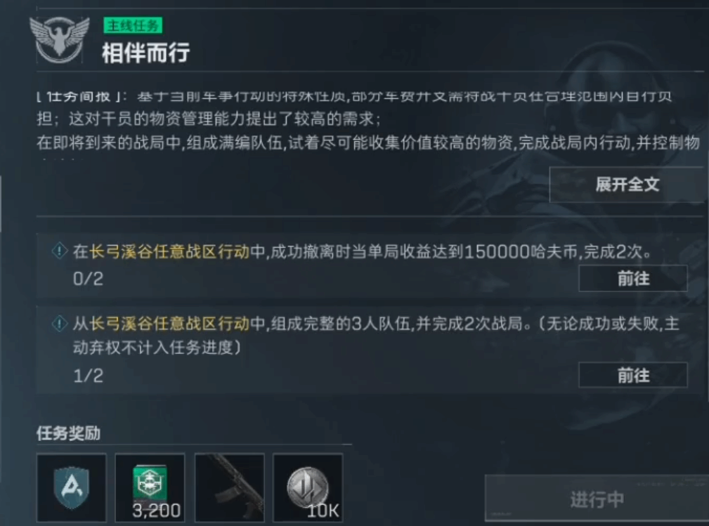 高额收益:在长弓溪谷任意战区行动中,成功撤离时当单局收益达到150000哈夫币,完成2次。